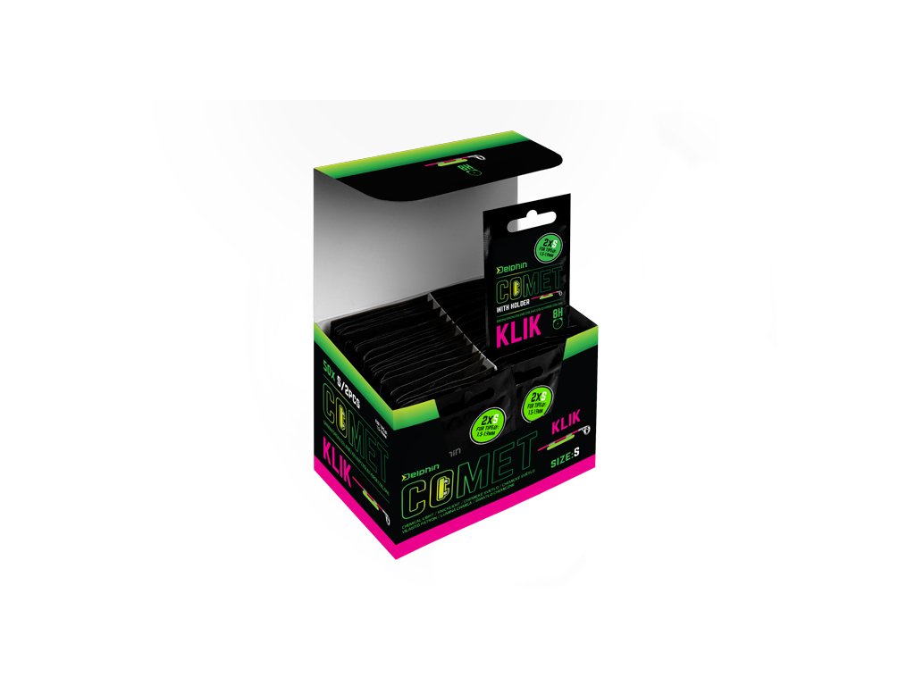 Chemické světlo Comet KLIK je vynikajícím pomocníkem při večerním a nočním lovu. V balení se kromě světla nachází držák, pomocí kterého je možné jednoduché upevnění na špičku prutu během lovu na feeder. Díky tomu zaznamenáte každý záběr i za tmy. Manipulace s tímto světlem je velmi jednoduchá. Zlomením žluté části uvnitř dojde k chemické reakci, která způsobí svícení této tyčinky. Pro rovnoměrné svícení doporučujeme po zlomení tyčinkou párkrát zatřást. Světlo je dostupné ve dvou velikostech. Díky pokrokové technologii je doba svícení až 8 hodin!