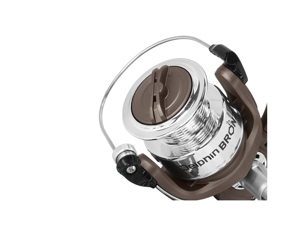 Delphin BRONZ je kompaktní naviják s přední brzdou v originálním designu. Barevnou kombinaci tvoří tmavě bronzové tělo, které přechází až do neutrální hnědé barvy. Tato barva je doplněna stříbrnými detaily, včetně cívky. Naviják kromě velmi povedeného vizuálu potěší zejména svojí cenou a spolehlivostí.