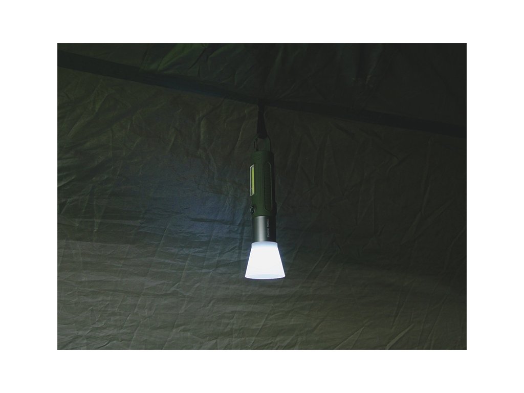 Prvním stisknutím se aktivuje hlavní dioda s funkcí ZOOM a 100% intenzitou svícení (140 lumenů), přičemž výdrž baterie v tomto režimu je přibližně 5 hodin. Druhý stisk sníží intenzitu světla na 50 % (70 lumenů). Třetím kliknutím se zapne druhá dioda s bílým světlem a plnou intenzitou 170 lumenů, ve které svítilna vydrží fungovat přibližně 5 hodin. Čtvrtým stisknutím se aktivuje zelené světlo, ideální například jako poziční osvětlení – jeho výdrž dosahuje až 24 hodin.