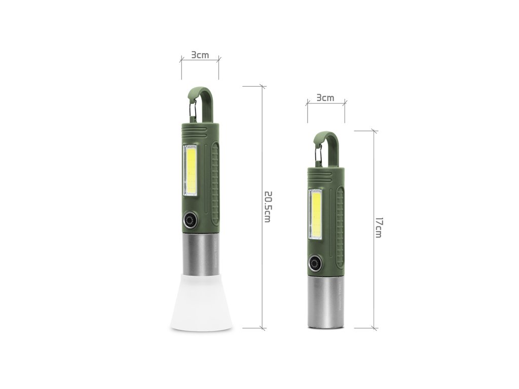 Režimy svícení: Hlavní LED dioda – bílé světlo (100%-5h, 50%-7h), druhá LED dioda – bílé světlo 100%-5h, zelené světlo 100%-24h