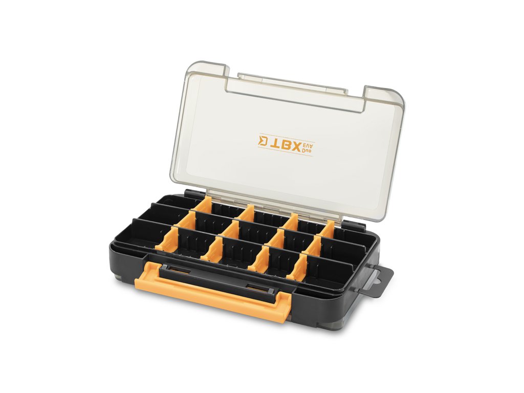 Vyrobena je z pevného plastu, který spolehlivě chrání nejen obsah, ale také samotnou krabici před nežádoucím mechanickým poškozením. Nabízí dva oddělené úložné prostory, uzavírané odolnými plastovými klipy.