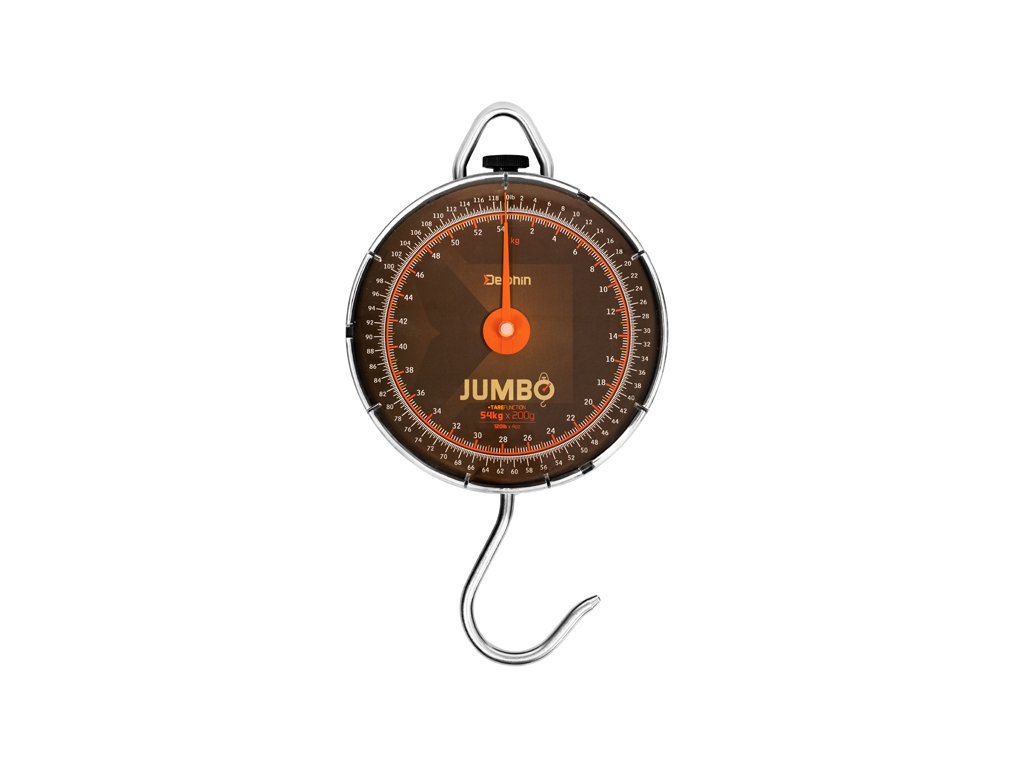 Robustní mechanická váha určená pro vážení těch největších úlovků. Masivní konstrukce váhy JUMBO umožňuje změření hmotnosti až do 54 kg s minimální odchylkou. Naměřená hodnota se za pomoci ručičky zobrazuje na velkém ciferníku ve dvou různých jednotkách - kilogramech a librách. Zvedání během vážení usnadňuje velmi pevný kovový držák. Díky svým parametrům si váha Delphin JUMBO najde uplatnění kromě rybolovu i při myslivosti či v jiných sférách běžného života.