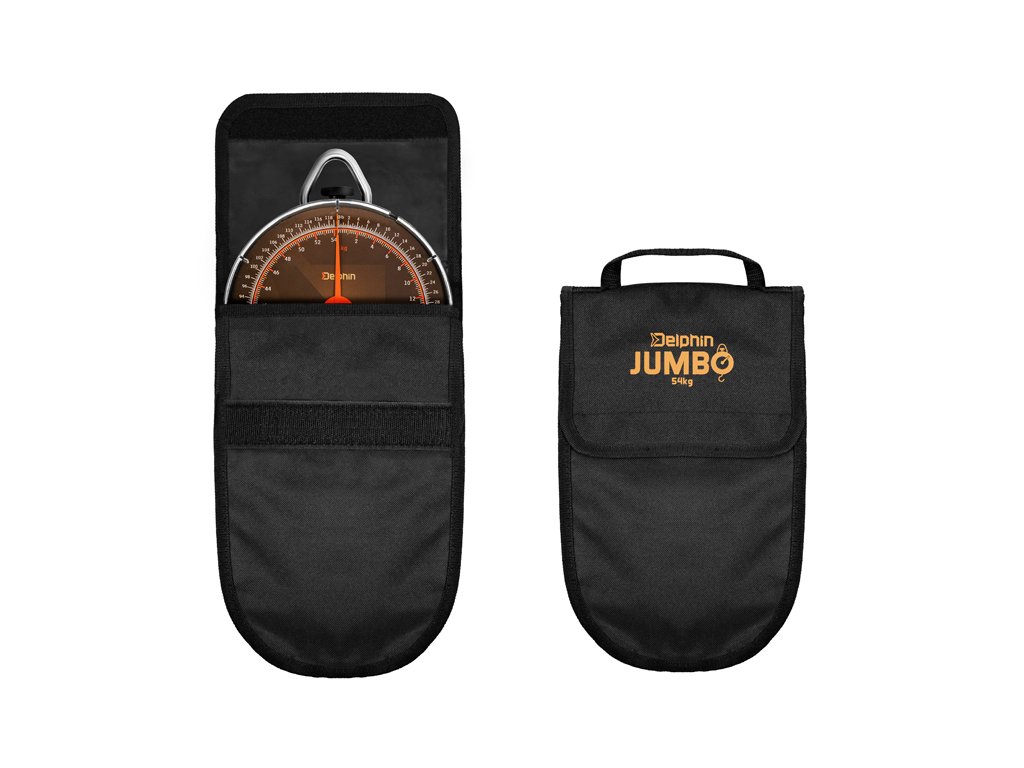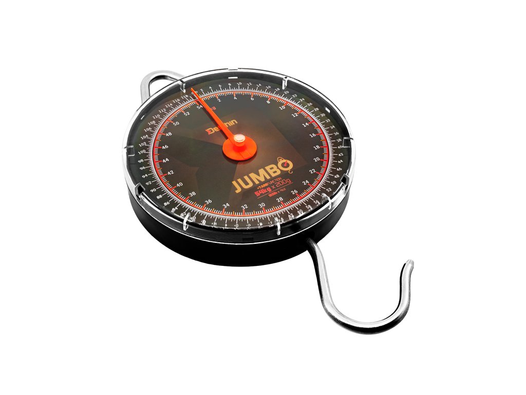 Robustní mechanická váha určená pro vážení těch největších úlovků. Masivní konstrukce váhy JUMBO umožňuje změření hmotnosti až do 54 kg s minimální odchylkou. Naměřená hodnota se za pomoci ručičky zobrazuje na velkém ciferníku ve dvou různých jednotkách - kilogramech a librách. Zvedání během vážení usnadňuje velmi pevný kovový držák. Díky svým parametrům si váha Delphin JUMBO najde uplatnění kromě rybolovu i při myslivosti či v jiných sférách běžného života.