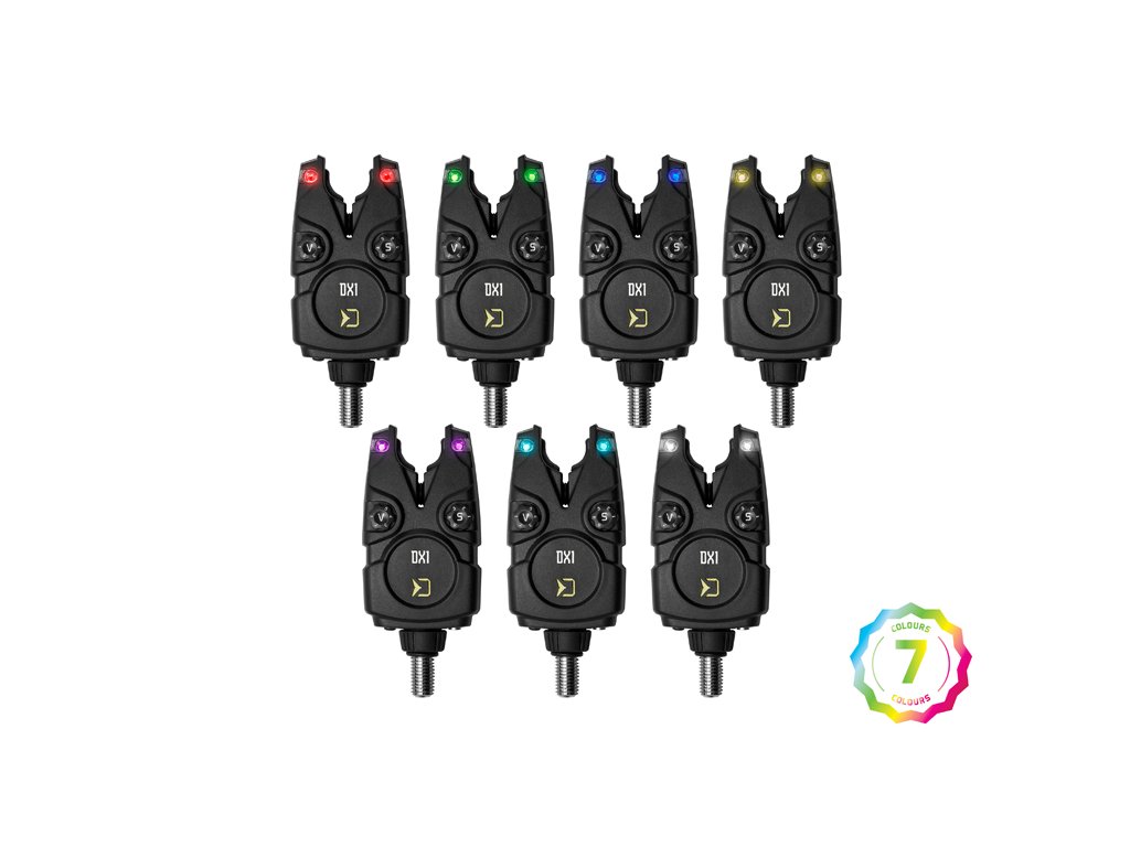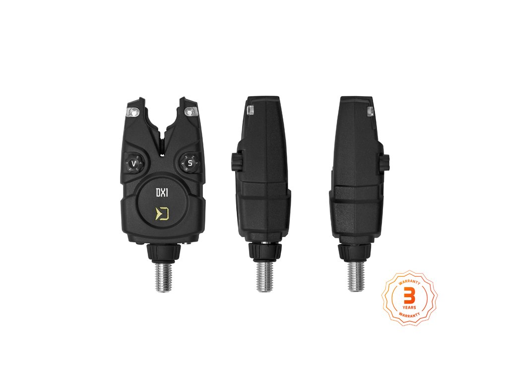 Signalizátor DX1 je napájen 1x12V baterií typu LR23A, která disponuje dostatečně dlouhou výdrží. V případě slabé baterie vás signalizátor upozorní krátkým pípnutím. Pomocí spínače "V" je možné vybrat jednu z 5 úrovní hlasitosti, včetně tichého módu. Také si lze navolit požadovaný tón a úroveň citlivosti, které mají také 5 různých úrovní. Nespornou devizou signalizátorů ze sady DX1 je možnost výběru ze 7 barev signalizační LED diody. Každý si tak vybere svou oblíbenou a pokud zatoužíte po změně, tak si jednoduše zvolíte jinou barvu dle návodu. Všechny zvolené nastavení si DX1 uchovává v paměti. Na zpětný záběr vás upozorní odlišný tón a po každém záběru se rozsvítí na dobu 15 sekund paměťová dioda. Ve spodní části se nachází vstup pro 2,5 mm konektor pro připojení svítícího indikátoru. Během nočního lovu lze zapnout také poziční diodu. Samozřejmostí je voděodolnost, díky čemuž se na něj můžete spolehnout v jakýchkoliv podmínkách.