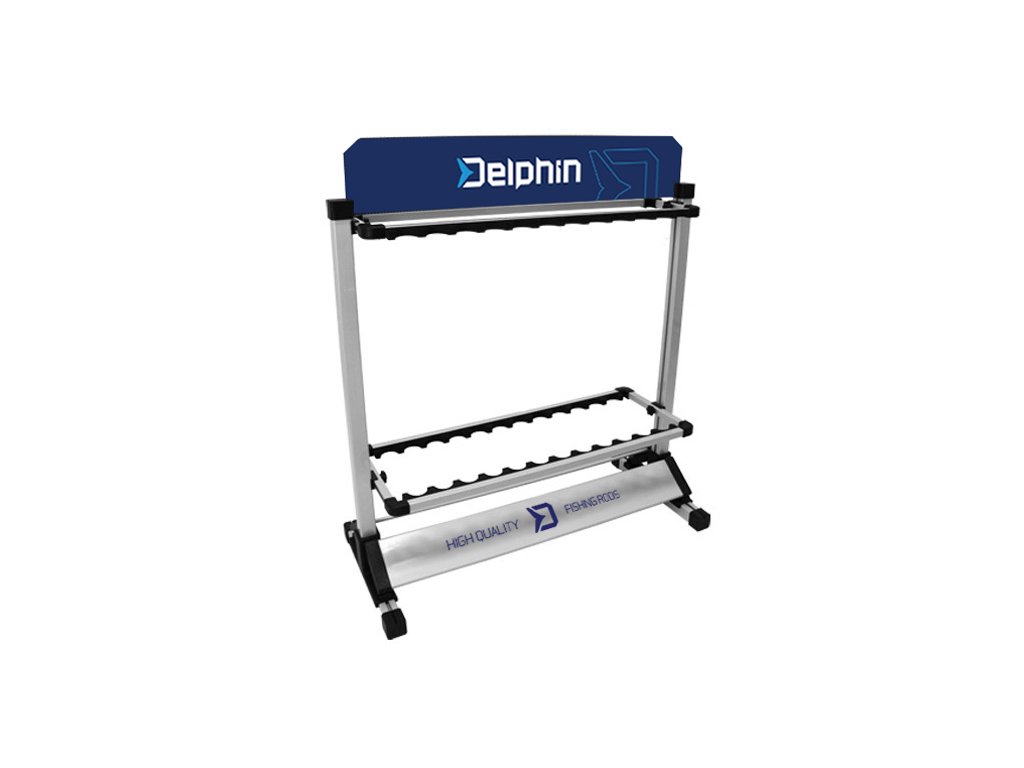 Designový stojan na pruty navržený tak, aby Vám je ukázkovou cestou prezentoval. Je vyroben ze silných hliníkových profilů které zajišťují jeho stabilitu a dlouhou životnost. Také dotvářejí jedinečný vzhled ve spojení s logem značky DELPHIN. Nastavitelná výška spodní a vrchní lišty držáků Vám umožní přizpůsobit si je na požadovaný odstup. Samotné lůžka pro jednotlivé pruty jsou pěnové a od sebe dostatečně vzdáleny na to, aby každý jeden prut ve Vaší prodejně vynikl. Rozměry stojanu na délku nepřesáhnou ani z daleka metrovou hranici, ale přece si v něm najde místo až 24 prutů (2x12).