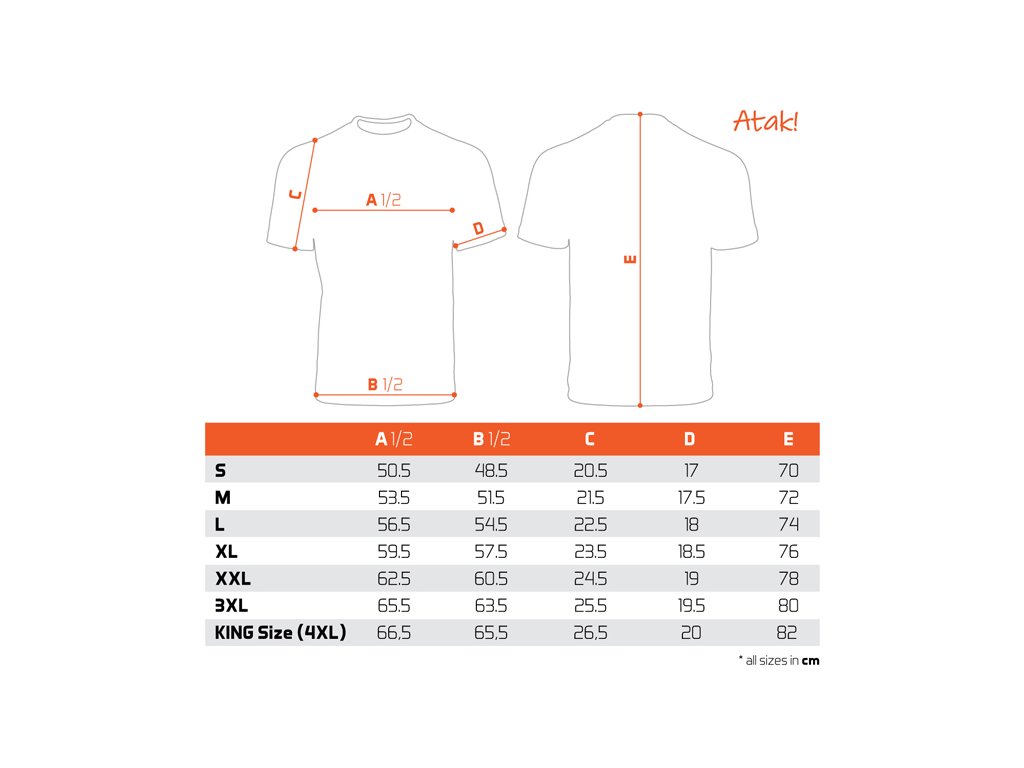 Samotné tričko je vysoké kvality, stejně jako použitý barevný tisk. Nabízíme je v široké škále velikostí od S až po KING SIZE (ekvivalent 4+XL, který je ve většině zemí označován jako XXXXXL). Model King size tedy hravě oblékne i ty nejstatnější rybáře o hmotnosti 135 kg+.