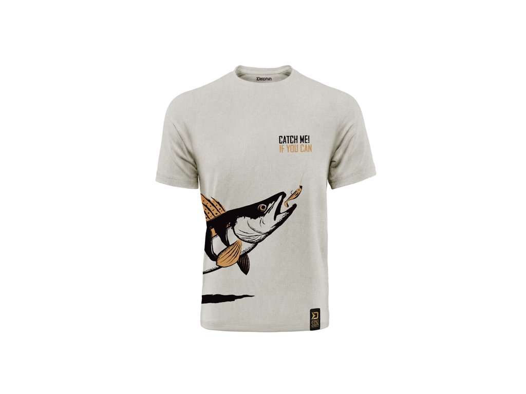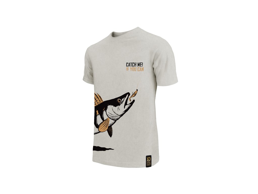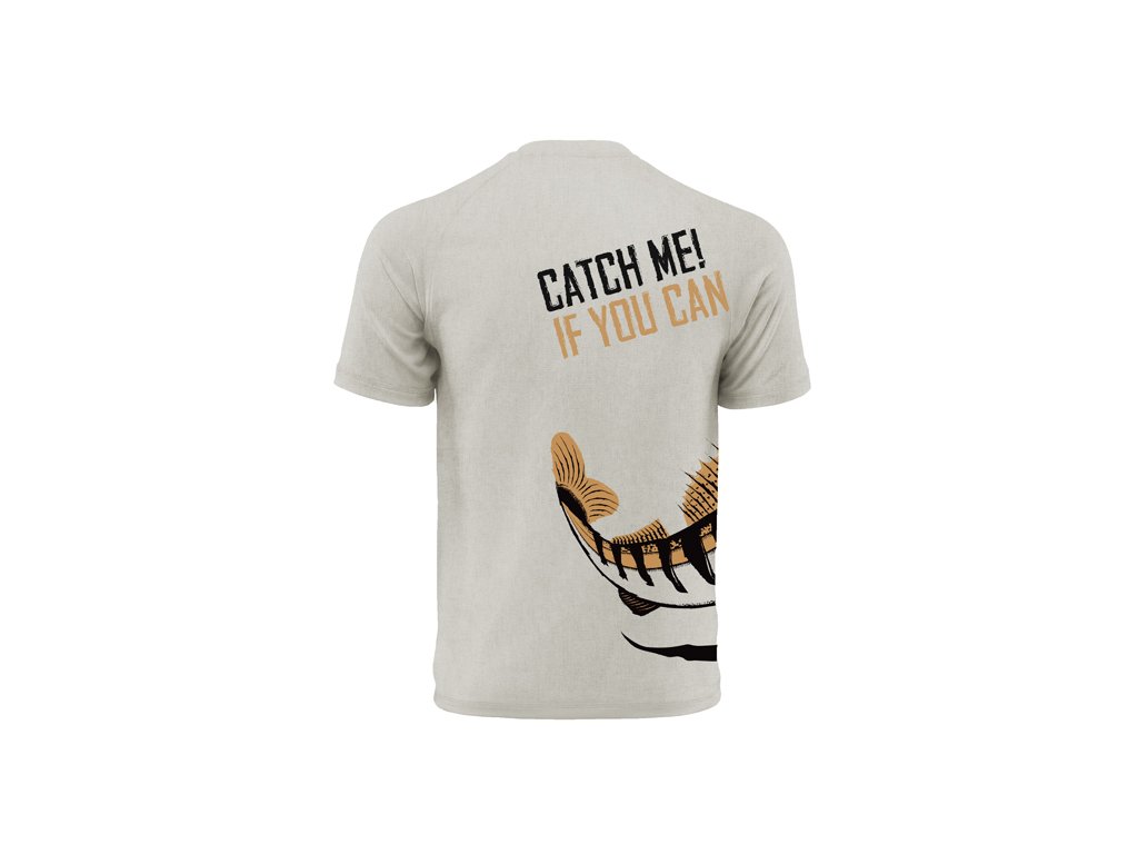 Tričko Catch me! CANDÁT je designované v krémové barvě s vyobrazením candáta, který se právě blíží k nástraze, což je moment, na který čekají všichni příznivci lovu těchto ryb.