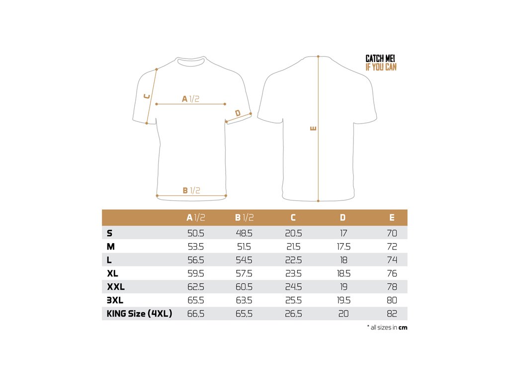 Samotné tričko je vysoké kvality, stejně jako použitý barevný tisk. Nabízíme je v široké škále velikostí od S až po KING SIZE (ekvivalent 4+XL, který je ve většině zemí označován jako XXXXXL). Model King size tedy hravě oblékne i ty nejstatnější rybáře o hmotnosti 135 kg+.