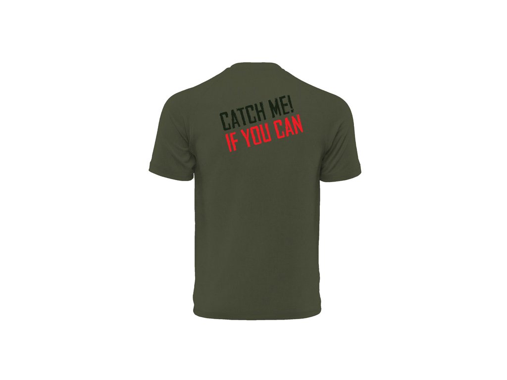 Tričko Catch me! OKOUN je designované v tmavě zelené barvě s vyobrazením okouna, který se právě blíží k nástraze, což je moment, na který čekají všichni příznivci lovu těchto ryb.