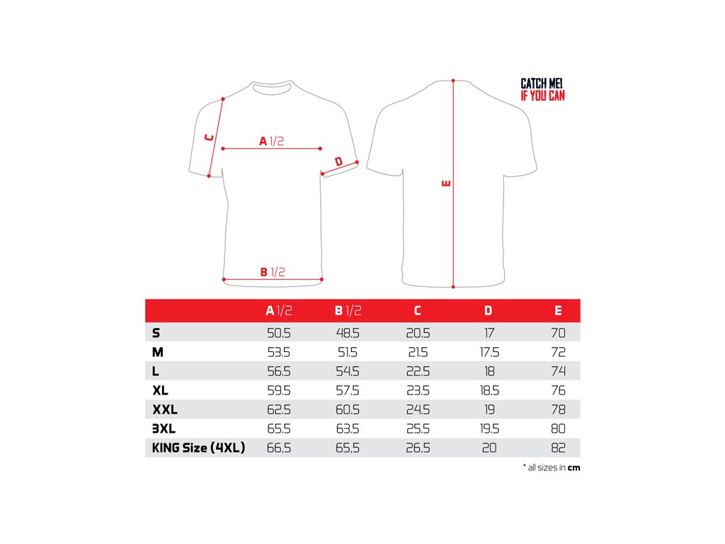 Samotné tričko je vysoké kvality, stejně jako použitý barevný tisk. Nabízíme je v široké škále velikostí od S až po KING SIZE (ekvivalent 4+XL, který je ve většině zemí označován jako XXXXXL). Model King size tedy hravě oblékne i ty nejstatnější rybáře o hmotnosti 135kg+.